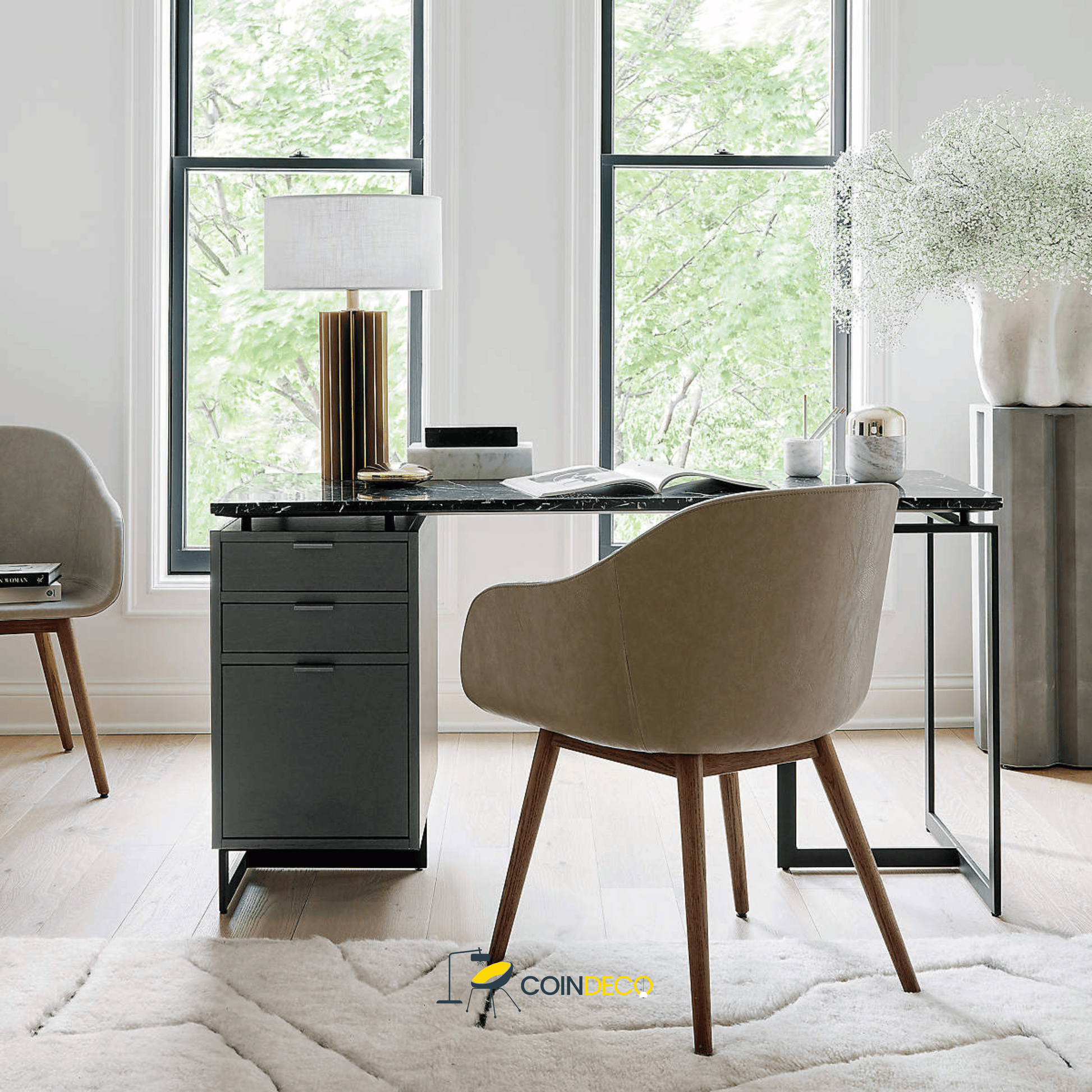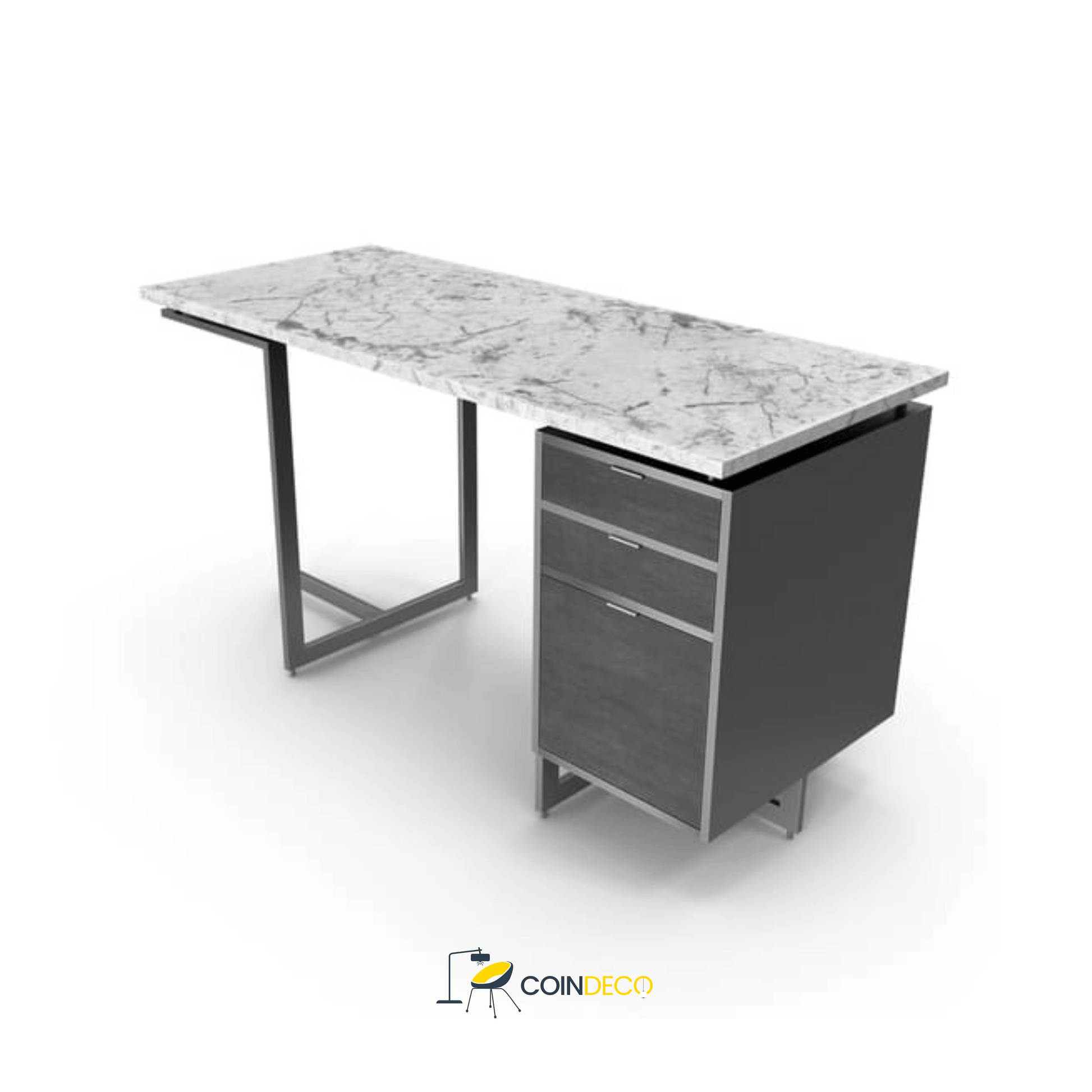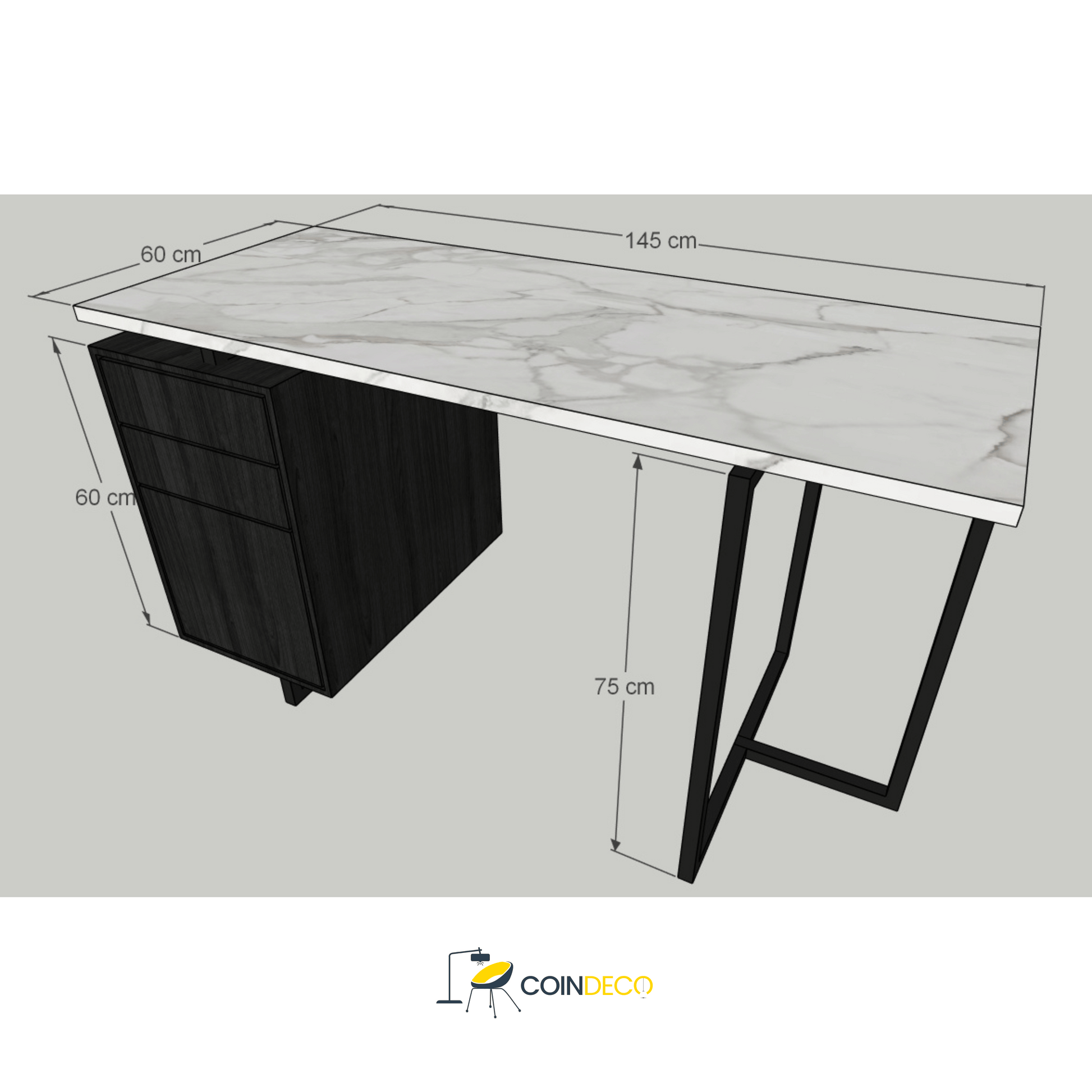 مكتب عملي وعصري بتصميم أنيق يجمع بين الفخامة والوظيفة. السطح العلوي مصنوع من رخام أبيض فاخر بنقوش رمادية طبيعية كيعطي لمسة راقية للمساحة. الهيكل معدني صلب باللون الرمادي الغامق كيوفر متانة وثبات عاليين.